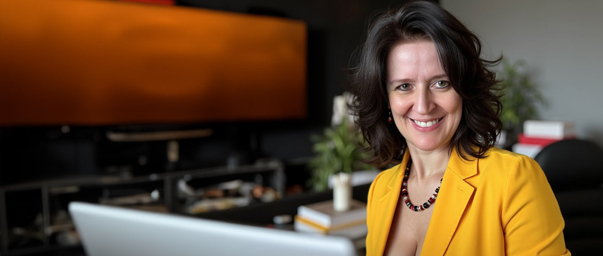 Nicole Angela Buck – KI-Trainerin und Kommunikationsdesignerin in ihrem Atelier, lächelnd in gelbem Blazer